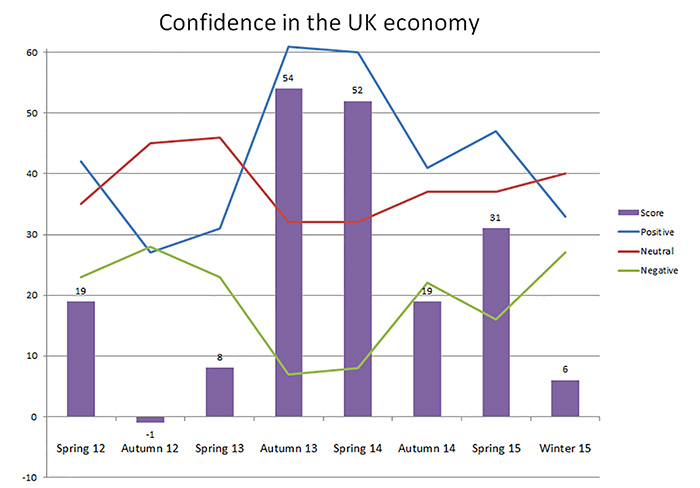 Of 983 respondents to an online survey, the sum of those who were more optimistic about the outlook for the UK than eight months ago, minus those who felt less optimistic, was 6%.